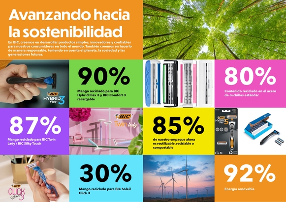 - Materiales Reciclados: Los mangos de los rastrillos ahora incluyen hasta 90 % de contenido reciclado en modelos como el BIC Hybrid Flex 3 y el Comfort 3 con repuesto, y 87 % en el renovado Twin Lady/Silky Touch. Actualmente se están haciendo mejoras en otros modelos.