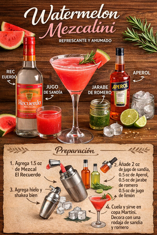 Para elevar la celebración, Mezcal El Recuerdo propone el Watermelon Mezcalini, un cóctel refrescante, ligero y lleno de color, ideal para arrancar la noche o acompañar una tarde entre amigos. La sandía aporta frescura, el Aperol un toque vibrante y el mezcal joven el carácter que distingue cada sorbo.